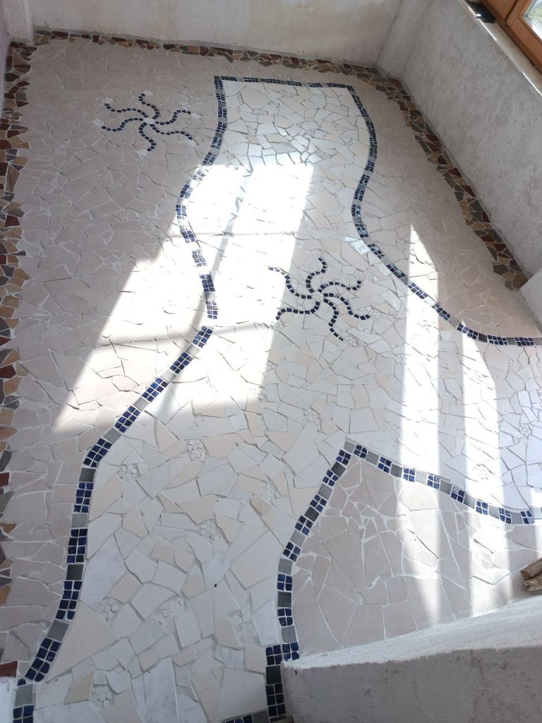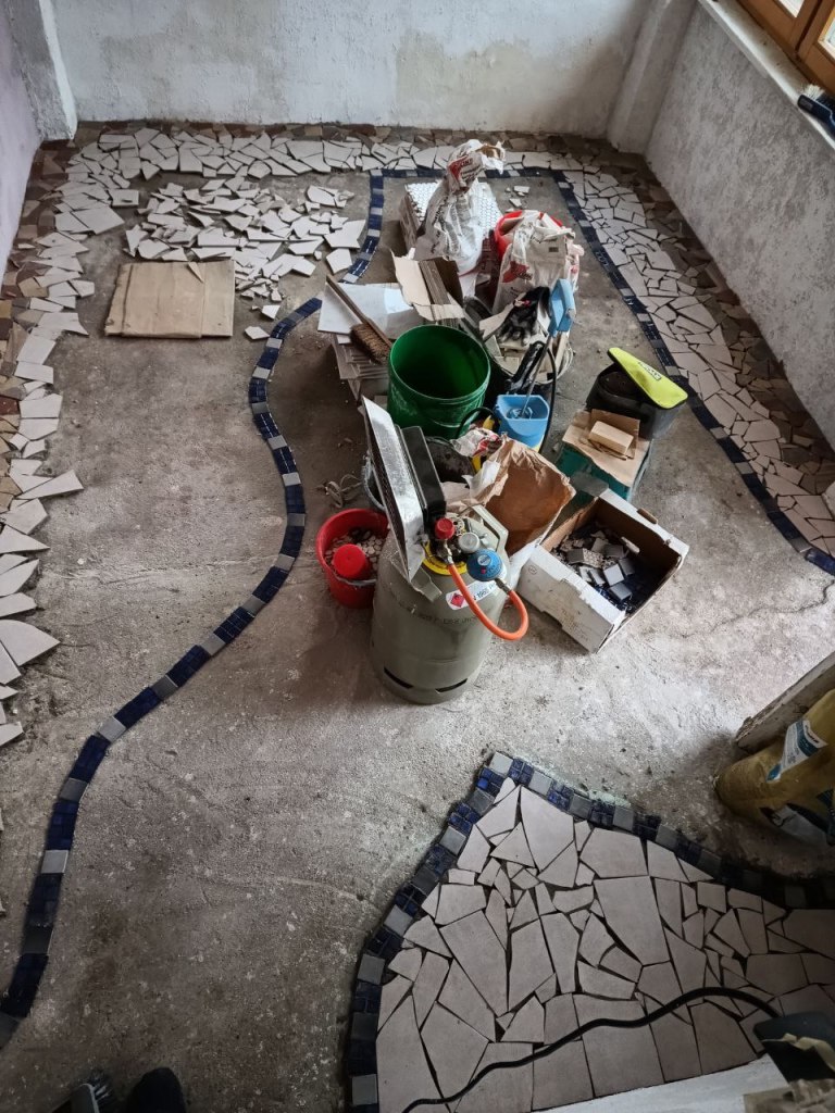 Bei dem Fussboden im Gartenhaus haben wir uns besonders viel Mühe gegeben, wir haben aus gesammelten Fliesenresten einen Mosaikfußboden gelegt, ja deutlich mehr Aufwand, aber es hat sich wirklich gelohnt. Dieser ist einfach nur wunderschön geworden.