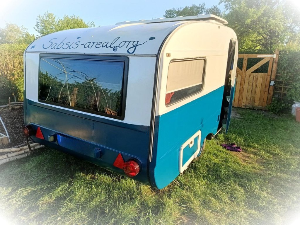 Unser letztes heimisches Pojekt, der Bau einer Jurte, wurde gerade rechtzeitig fertig, um unser verbliebenes Hab und Gut zu beherbergen. Und unser Mini-Wohnwagen, in dem wir nun vorerst leben, hat mit einem neuen Anstrich seine letzte Veredelung erhalten – oben reinweiß und und unten ozeanblau ist er wirklich eine Augenweide.