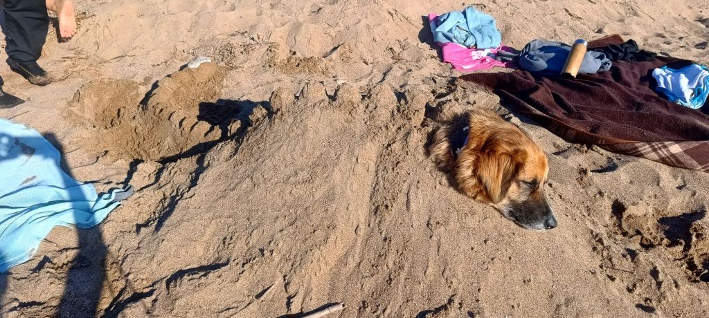 Da viele Menschen vom Strand mitgesucht hatten, informierte ich die Gruppe, dass wir ihn tot aufgefunden hatten. Ich lud alle ein, die wollten, zur Beerdigung. Oskar war hier bekannt wie ein bunter Hund. So viele hatten ihn in ihr Herz geschlossen, weil er täglich seine Runden drehte, um „Hallo“ zu sagen. Manchmal stibitzte er etwas zu fressen oder holte sich eine Portion Streicheleinheiten ab.