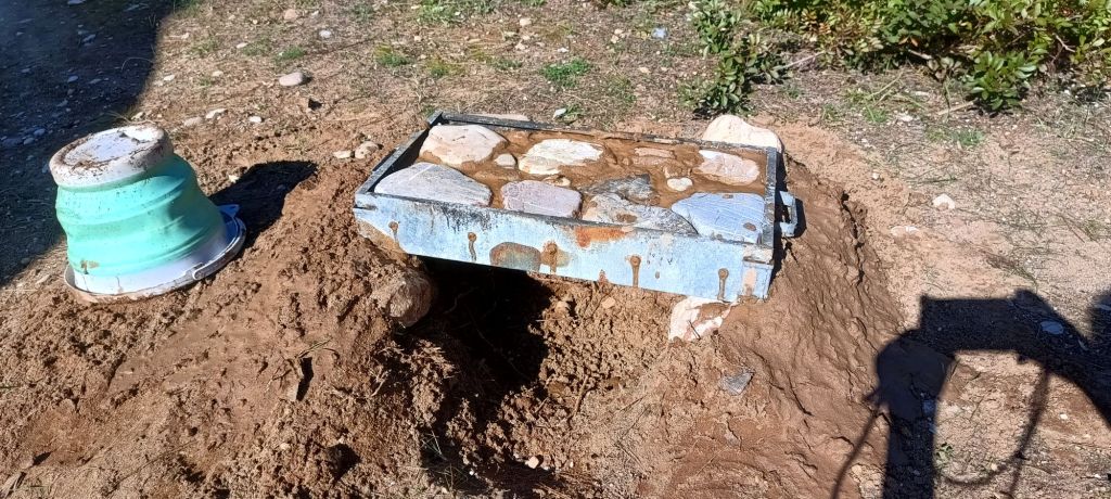 Zunächst haben wir eine Vertiefung in den Boden gegraben und sie mit Steinen eingefasst, um eine stabile Basis zu schaffen. Glücklicherweise fanden wir noch einige Reste eines alten Grills, die wir als Zwischenboden nutzen konnten. Diese haben wir mit einer Mischung aus Steinen und Lehm aufgefüllt, um eine stabile Konstruktion zu erhalten. Zudem besorgten wir eine große Steinfliese, die als Backfläche dienen sollte.