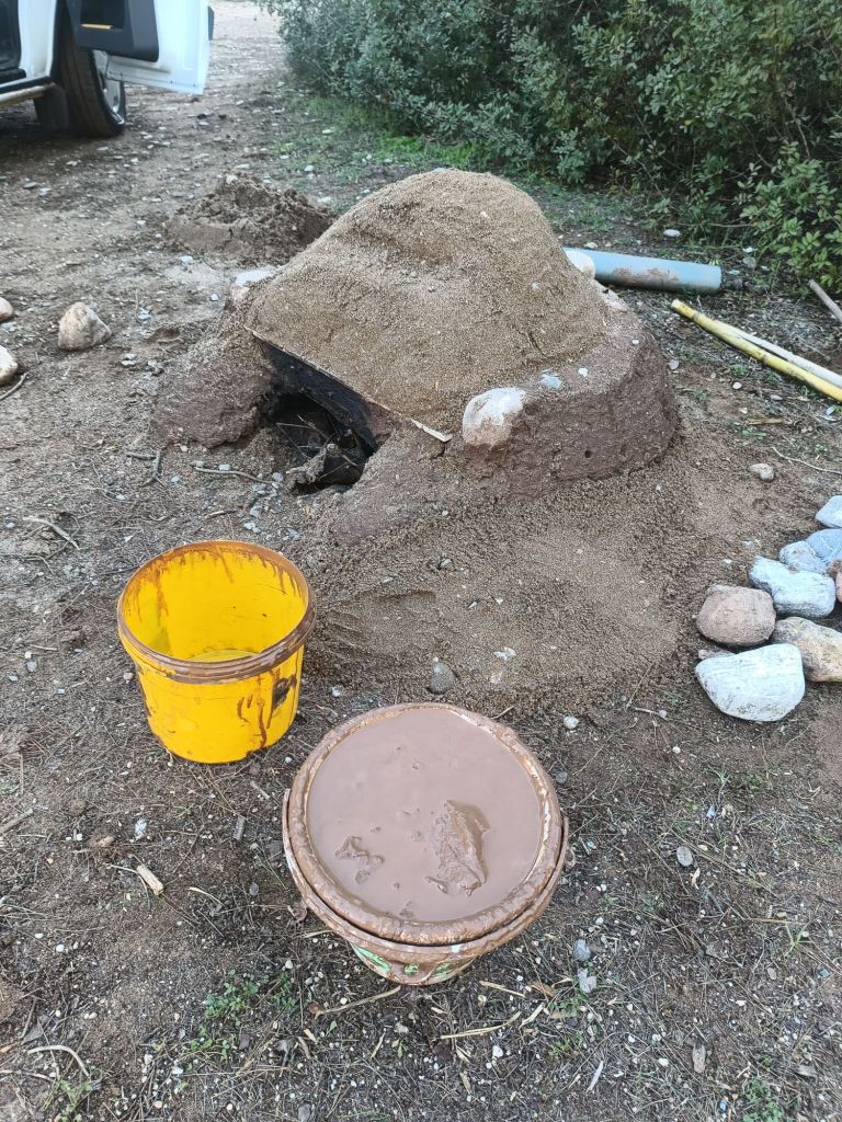 Nun begann der eigentliche Bau des Ofens. Wir haben uns dabei bewusst Zeit gelassen und ohne Druck gearbeitet. Die grundlegende Gestaltung habe ich im Vorfeld geplant, aber das Mischverhältnis von Lehm und Sand lief ganz nach Bauchgefühl. Die Kuppel stellte eine besondere Herausforderung dar, da wir kein geeignetes Material zur Stabilisierung fanden. Deshalb nutzten wir eine bewährte Technik: Wir formten eine Halbkugel aus Sand, auf die wir dann Lehmkugeln schichtweise auftrugen und so die Kuppel errichteten.