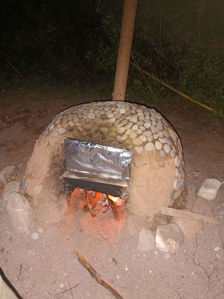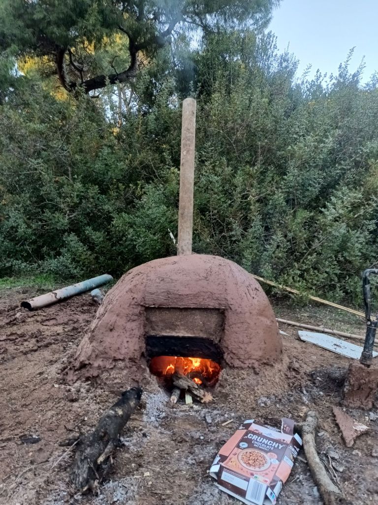 Ein glücklicher Fund war ein Metallrohr, das wir als Rauchabzug verwendeten. Dadurch gelang es uns, eine gute Luftzirkulation zu schaffen. Da es derzeit kein Sommer ist, brauchte der Ofen einen ganzen Tag zum vollständigen Trocknen. Währenddessen haben wir ihn regelmäßig befeuert, zunächst mit Pappe und trockenen Ästen, später mit Holz. Nach dem Trocknen entstanden einige Risse, die wir anschließend mit frischem Lehm reparierten.