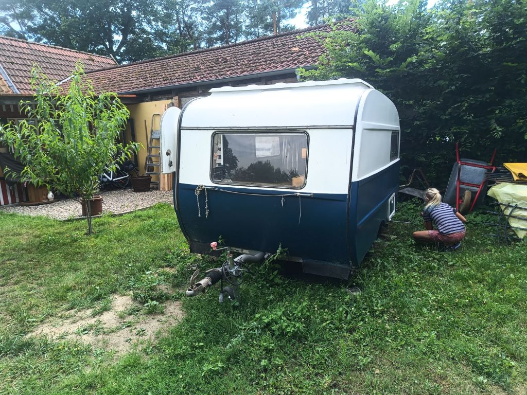 Und dann unser Qek Junior – der kleine Miniwohnwagen. Er stand nicht zum ersten Mal vor dem TÜV, sondern sollte neuen TÜV bekommen. Beim ersten Versuch: durchgefallen. Nie zuvor hatten die Bremsen Probleme gemacht, doch natürlich beim Prüftermin funktionierten sie plötzlich nicht mehr richtig. Also zurück in die Werkstatt. Die Männer nahmen alles auseinander, reinigten, schmierten neu und bauten wieder zusammen. Glücklicherweise war nichts kaputt – nur eine gründliche Pflege war nötig, und danach funktionierten sie wieder wie neu.